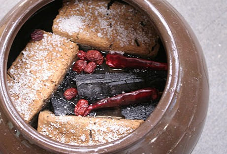 (3) 메주 넣기 : 준비된 항아리에 메주를 차곡차곡 담습니다. 메주가 소금물에 완전히 잠기도록 해야 잡균 번식을 막을 수 있습니다.