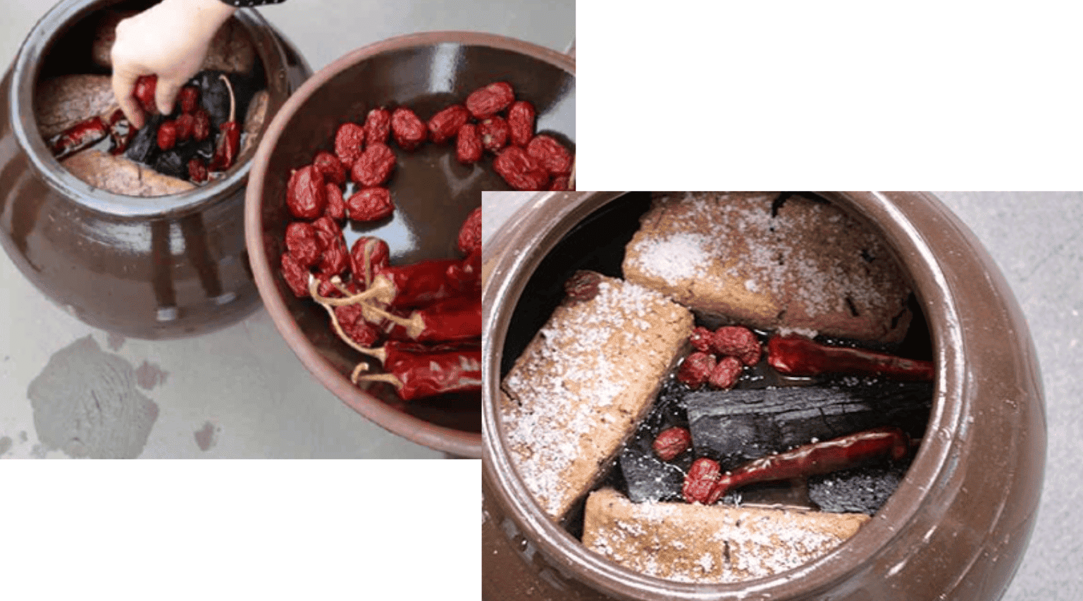 (4) 부재료 넣기 : 숯, 고추, 대추 등을 넣어 잡균 번식을 막고 맛과 향을 더합니다. 🌶️ 숯은 잡냄새 제거와 정화 작용을 하고, 고추는 🌶️ 매운맛과 살균 효과를 더하며, 대추는 단맛을 더하고 잡균 번식을 막아줍니다.